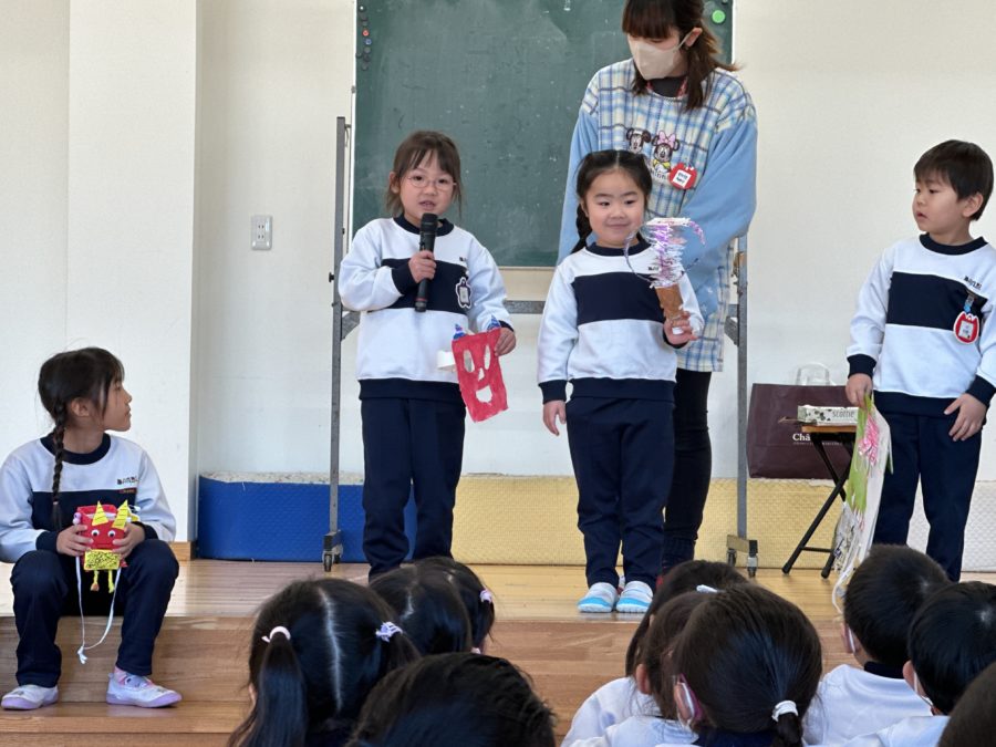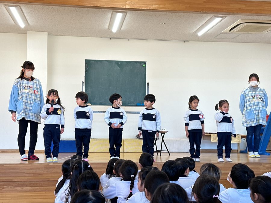 2日、2月生まれさんのお誕生会と豆まき集会を行いました。2月生まれさんには「心の中にいる鬼は何ですか?」というインタビューを行いました。泣き虫鬼、怒りんぼう鬼、イヤイヤ鬼、のんびり鬼…様々な鬼が心の中にいるようです。やっつけるためには自分ではどうしていけばいいのか、を考えるきっかけになったと思います。