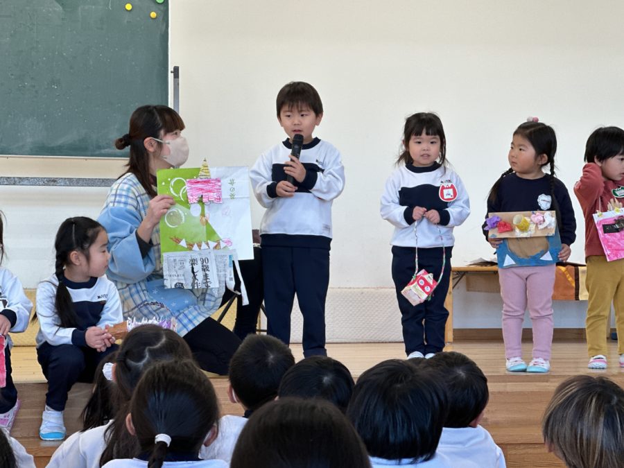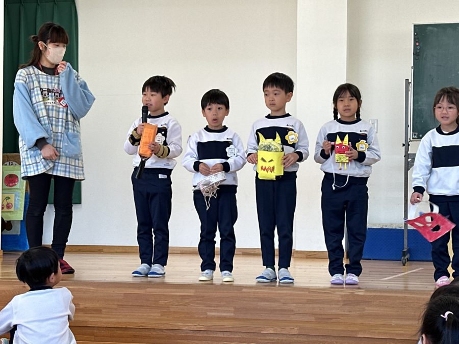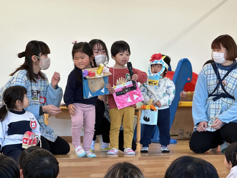 それぞれの学年での鬼のお面ファッションショー。年長さんは自分で考えたオリジナル鬼のお面製作、年中さん、年少さんでは自分で選択することも取り入れながらの製作、0,1,2歳児のお友達は指先を使うことを意識した製作で鬼のお面作りをお行いました。お家で頑張ったところを聞いてあげてくださいね。
