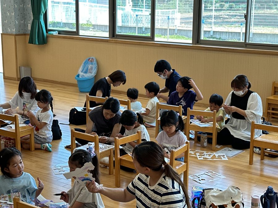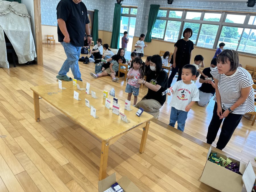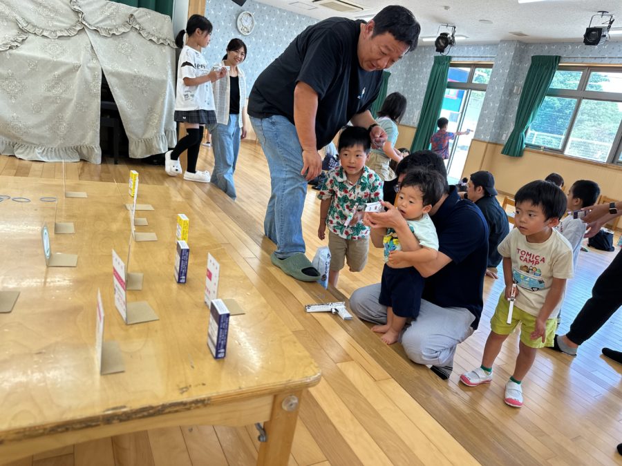 自分たちで組み立てる、親子で会話をしながら、一緒に遊ぶ…などなどほほえましい親子の時間となりました。自分の鉄砲が完成したら的当てゲームを行い、幼稚園生から大人まで本気で的をねらって、商品をゲットしました。