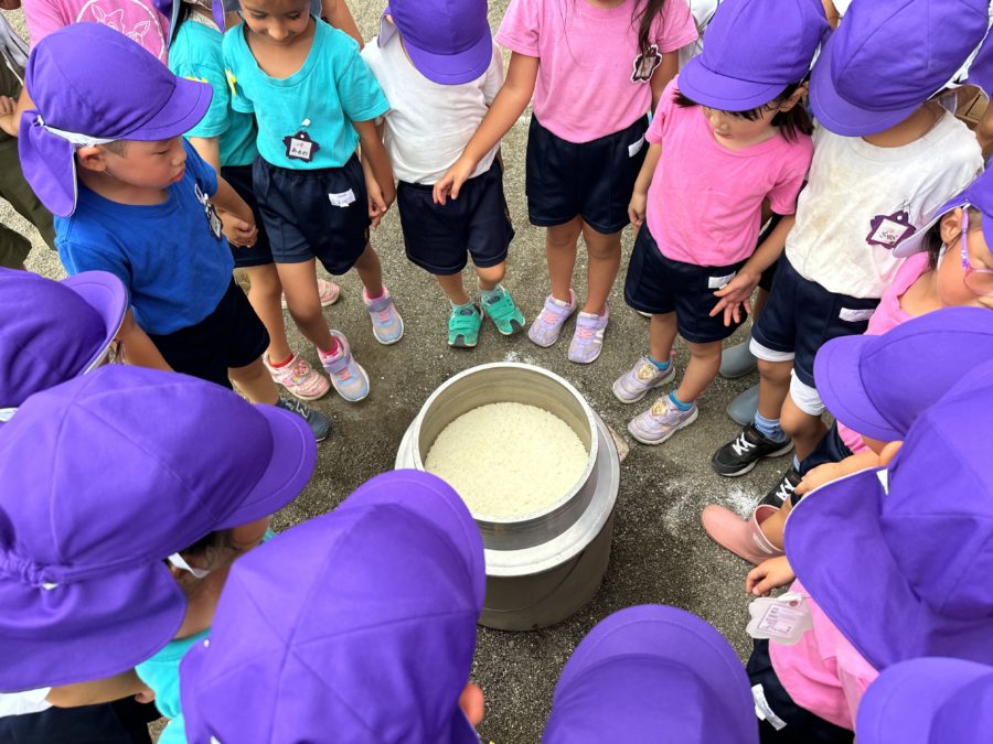 今月は「かまどごはん」です。今日は年少さんと年中さんが自分たちで取ってきた木の枝を燃やして、かまどでご飯を炊きました。バンビ幼稚園では、「火」を使う経験もさせたいという思いで毎年9月にはかまどでご飯を炊きます。また、普段は指一本でごはんが炊ける時代ですが、ご飯を炊くには手間暇かかること、また「あんばい」というのも学んでいければと思っています。