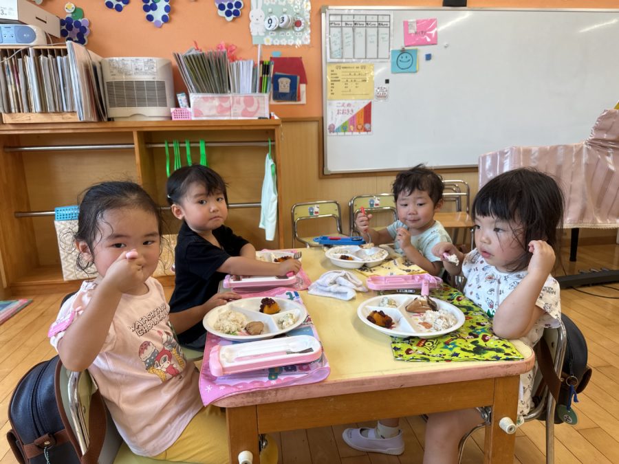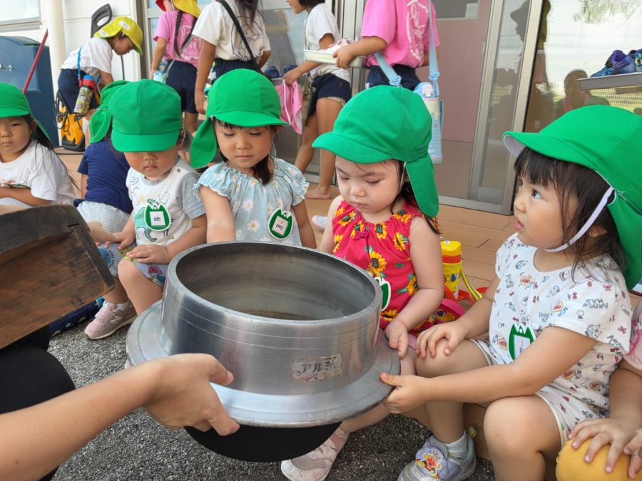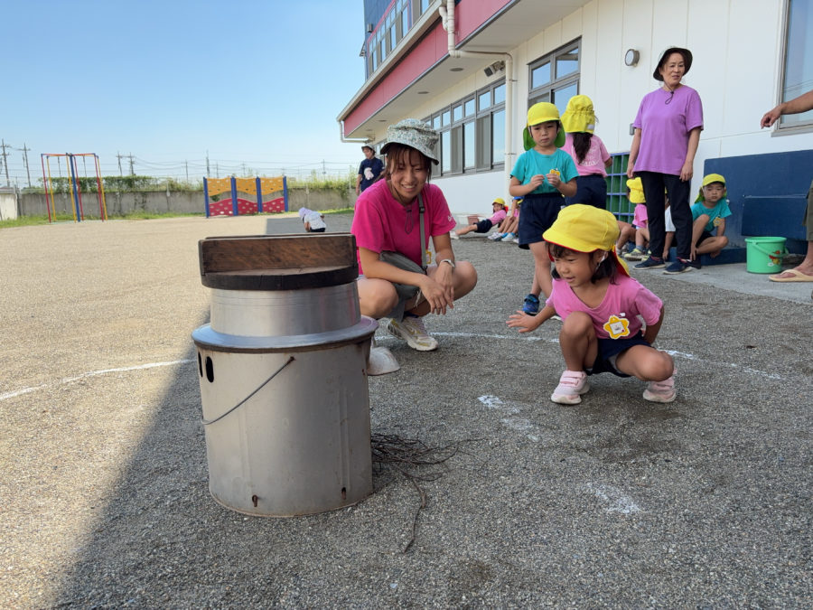 金曜日に行う予定でした『かまどごはん』。あいにくの台風のお天気でしたので、8日(月)に変更して行いました。一人ひとりが枝をかまどに入れ、それがエネルギーとなってご飯を炊きます。昔は、火の番をするのが子どもの仕事だったんだよ、なんてキヌエ先生に教えていただきながら。
