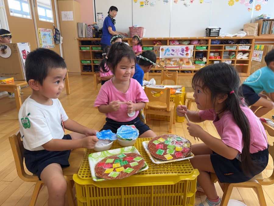 0,1,2歳児組さんでは、手先を使いながら、お友達とのかかわりを楽しみながらの縁日ごっこ。