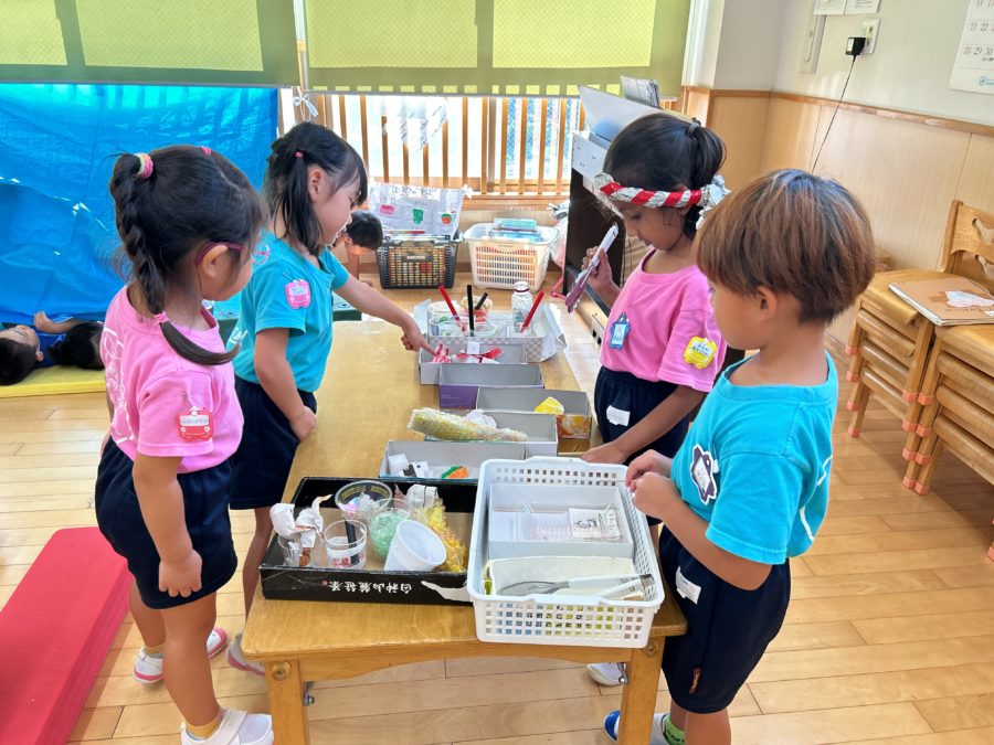 年長組では、ゲームの景品づくりやチケット作りにも発展したり、ゲームも難易度アップしたり、お店屋さんになって進めていったりの縁日ごっこ。