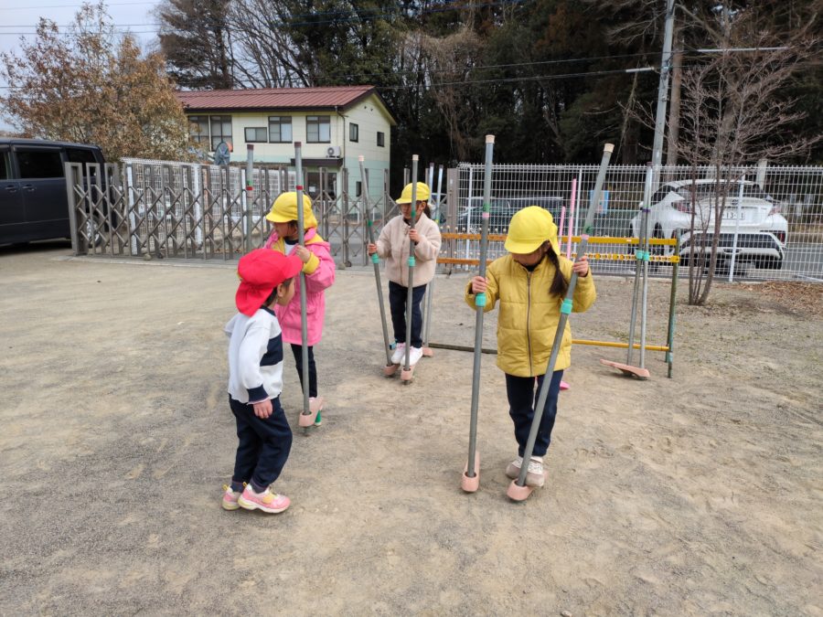 今週は3学期の『とことんウィーク』の週間です。3学期は「製作(光)」「竹馬」「大縄跳び」「短縄」「ゴム跳び」「伝承遊び」「鬼ごっこ」「野球」「バンビの秘密」を設定しています。 少しずつ温かくなってきていますが、今回は体を動かすことを中心とした遊びを設定しています。「身体を動かすことで、体力の向上につなげる。お友達と関わり合いながら、挑戦したり、イメージを共有したり、時間・空間を共有する。バンビの伝統(リュウノヒゲの青い実)や伝承遊びも伝えていく。」ことをねらいとしてとことん遊んでいきます。遊びを応援していただけたら嬉しいです。