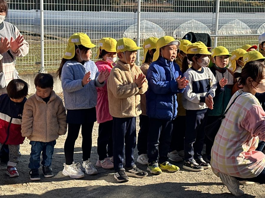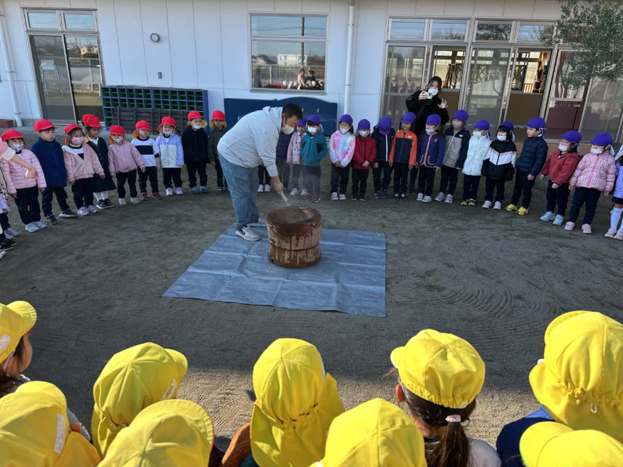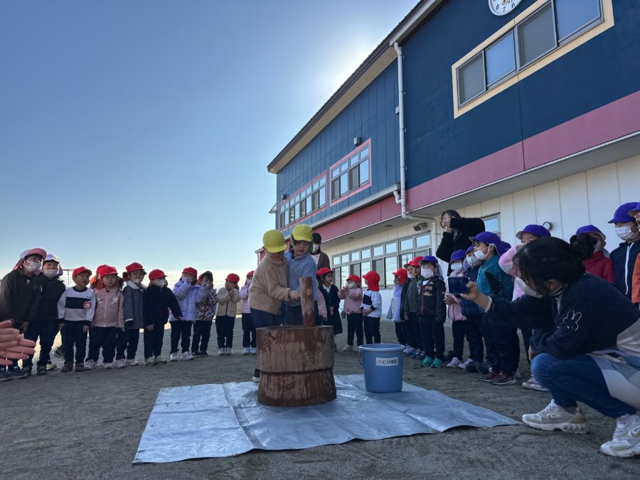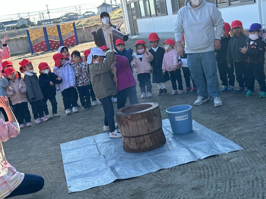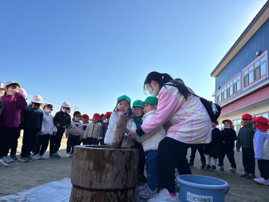 本日19日は『もちもちの日』です。○日本の伝統を味わう○年末という時期を感じる○みんなでお餅つきをして、一年に感謝をし新しい年を迎える準備をする ことをねらいとしています。 2人で持っても重い杵を「お米の状態からお餅にするぞ」の思いを載せて、子どもたちと一緒にお餅つきをしました。毎年恒例の伝統行事であり、ピンと張った寒さの空気、青空、みんなとの息の合った掛け声…1年を締めくくる素敵な行事となりました。 子どもたちがついたお餅は、来年の歳神様の『鏡餅』となります。給食では、きな粉餅にして、ひよこ組さんはきな粉ご飯にしておいしくいただきました。