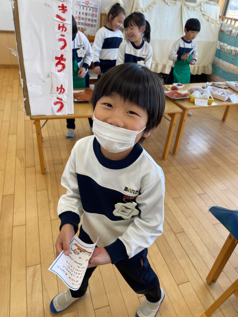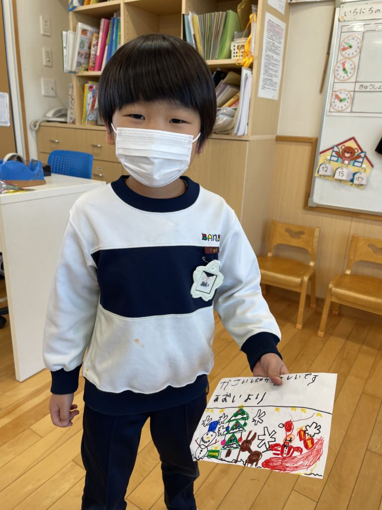 年長さんになると文字への興味が出てくるので、自分の思いを文字であらわしています。年中さんでは文字に興味がある子も少しずつ出てきて自分の名前を書いたり、絵で表す子がいたりと自分の表現でお手紙を書いています。年少さんでは、子どもたちの思いを先生が文字にしてくれて、絵と先生の文字でお手紙を仕上げています。