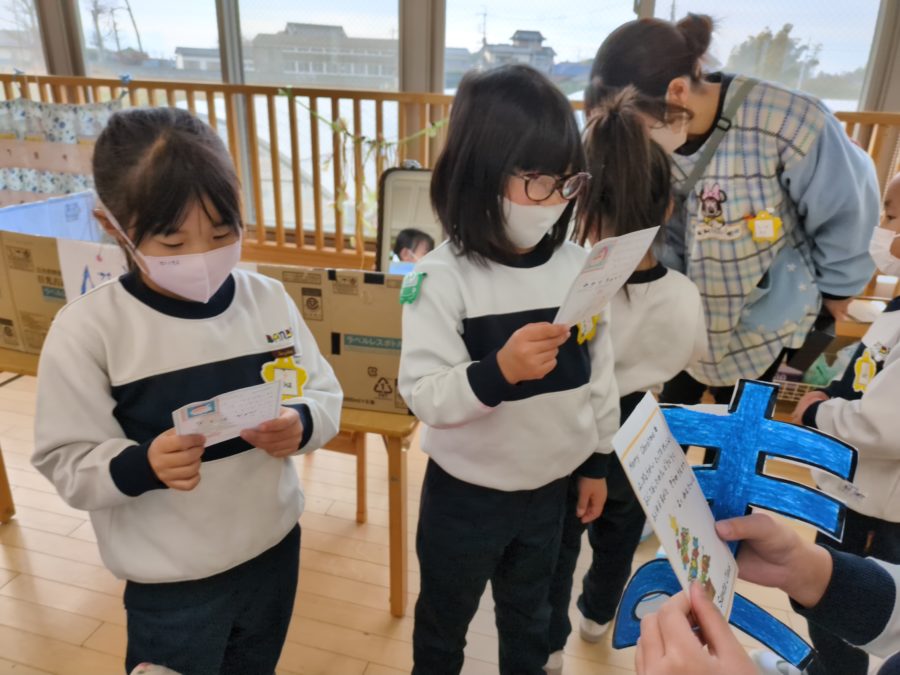 クリスマスを心待ちにしながらクリスマス飾りを作ったり、サンタさんにお手紙を書いてサンタポストに入れに来たりしています。子どもたちはクリスマスに向けてワクワクが止まらないようです。 サンタポストには続々お手紙が届いています。年長さんになると一文字一文字丁寧に心を込めて書いてる様子がうかがえます。その中にサンタさんに感謝する気持ちも込められていることに驚かされます。優しさが伝わってきます。(サンタさんから聞いたお話によると、です。)お手紙をサンタポストに入れると、なんとサンタさんからお返事が届くんです。「お手紙が来たよ」と、一文字一文字大事に読む年長さんの姿が見られます。 昔の人はよく「お天道様が見ている」と言っていましたが、良いことも悪いこともちゃんと誰かが見ていてくれるんですよ。お天道様もサンタさんも、自分自身もですね。