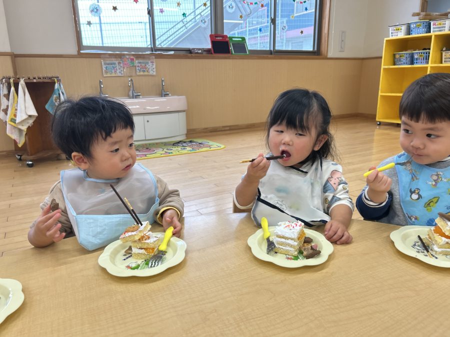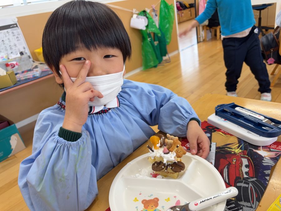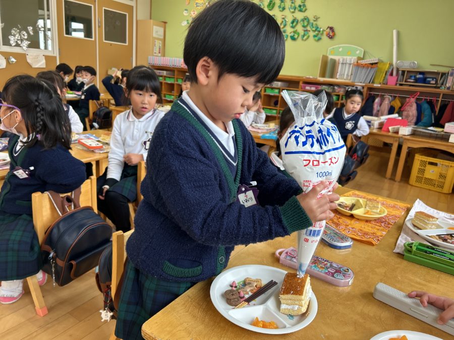 園では、ご褒美のケーキ作り。クラスで1つトッピングを決めて、全部で7種類のお菓子を自分でトッピングしました。本物のケーキ屋さんにもなれた日です。 とっても最高の1日で2学期を締めくくりました。2学期はたくさんの行事もあり、子どもたちの成長を感じれた学期だったことでしょう。子どもたちの頑張りを褒め、「その子らしさ」を磨いていきましょうね。お家の方にも大変ご協力いただきました。ありがとうございました。冬休みでは、日本の文化やお家の文化を伝えるいい機会の行事(お正月)があります。家族で過ごす時間を楽しんでください。