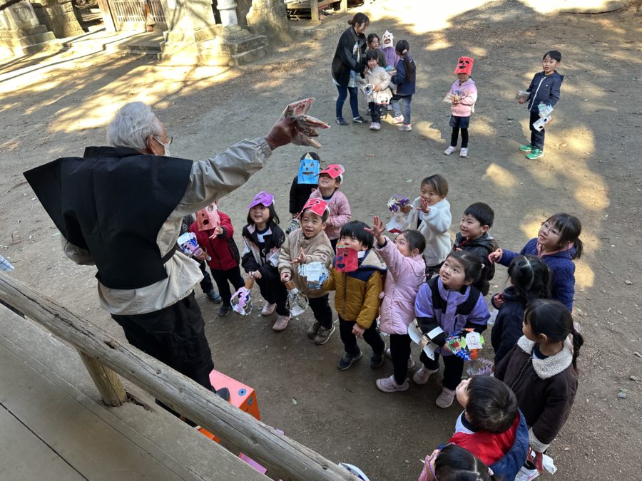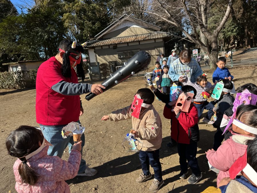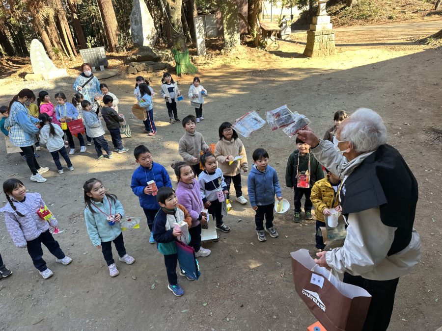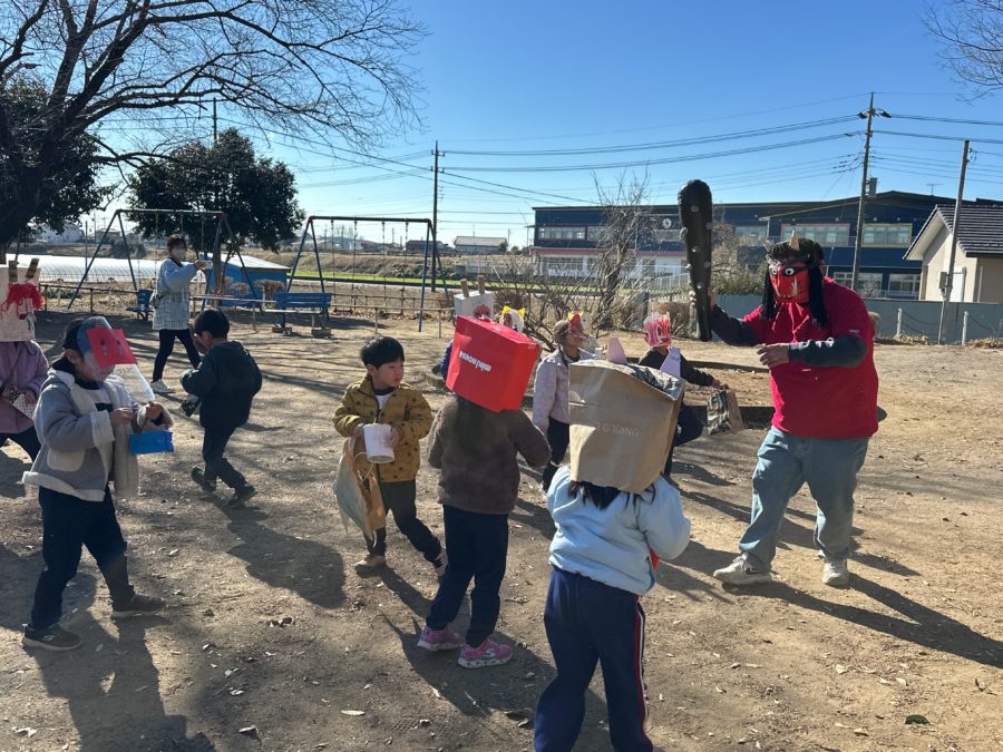 「〇〇鬼は外」と言いながら、大崎公園での鬼退治。しっかりと自分の心の中の鬼と向き合いました。自分の心の中にいる鬼をやっつけたら、大前神社に行って福の神様からお菓子のお土産がいただけます。「自分で頑張ることが大切なんだよ」と教えていただきました。
